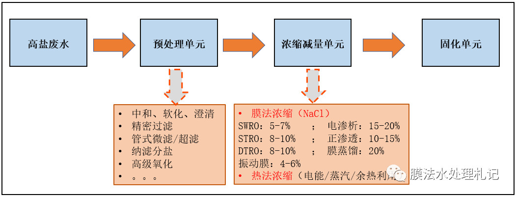 這些年零排放組合工藝越來越成熟,盡管可選的配套工藝繁多,但是總結歸納下來,末端高鹽廢水處理系統主要含以下幾個單元: