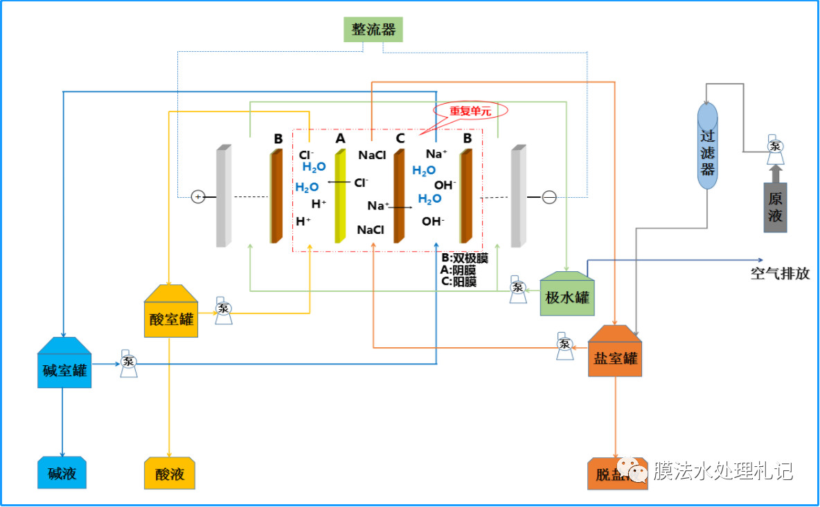 雙極膜電滲析的系統相對簡單,系統能耗主要由整流器、動設備組成。以下是常規雙極膜系統簡易流程圖。