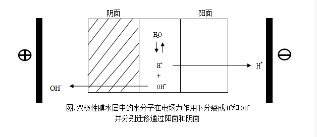 雙極性膜,電驅動膜的一種,主要作用是在電場力下提供H+離子和 OH-離子,膜的一側為陰面,另一側為陽面,陰面和陽面的中間層為水層,在外加直流電場力的作用下,水層中的H2O分裂成H+離子和OH-離子,并分別通過陽面和陰面,如圖所示: