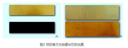 陽膜為苯乙烯系磺酸型均相陽離子交換膜(JCM-Ⅱ)(圖5A下);陰膜為苯乙烯季銨型均相陰離子交換膜(JAM-Ⅱ) (圖5A上);雙極膜為苯乙烯系陽面為磺酸型,陰面為季銨型均相雙極性膜(BPM-Ⅰ)(圖5B)。雙極膜電滲析器中的這三種膜均為我公司自主研發生產。在外加直流電場力的作用下,陰膜只讓陰離子通過而阻擋陽離子,陽膜只讓陽離子通過而阻擋陰離子,雙極膜的陰,陽膜界面層的水分子解離產生OH-和H+并分別通過陰、陽層給相鄰隔室提供OH和H+;它們具有耐強酸、強堿,柔韌度強,機械強度高,使用壽命長等特點。各膜性能指標如下:
