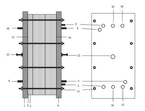 (1)陽極導流板;(2)彈性隔板;(3)膜;(4)陰極導流板;(5)堿進水口;(6)酸出水口;(7)陰極液進水口;(8)陰極液出水口;(9)陽極液進水口;(10)陽極液出水口;(11)緊固螺栓;(12)陰極接線柱;(13)陽極接線柱;(14)不銹鋼陰極;(15)鈦涂釕陽極;(16)鹽進水口;(17)酸進水口;(18)鹽出水口;(19)堿出水口