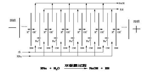 雙極膜是一種一面是陽離子交換層而另一面是陰離子交換層的層狀膜,陽離子交換層和陰離子交換層的接界處為水層,在外加直流電場的作用下,水層的H2O裂解成H+和OH-,并分別通過陽離子交換層和陰離子交換層。雙極膜是雙極膜電滲析器的關鍵部件。雙極膜電滲析器就是利用雙極膜分解水以及陰、陽離子交換膜的選擇透過性將鹽轉變為酸和堿的電滲析裝置。原理如圖1
