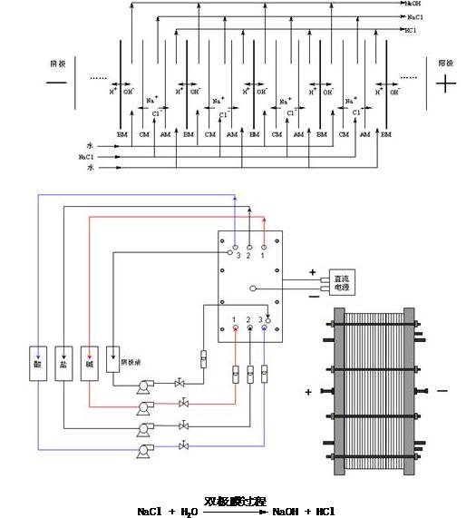 在直流電場作用下,溶液中的離子發生定向遷移,鹽室中的陽離子透過陽膜,被雙極膜的陰層所阻擋而留在3室,同時雙極膜解離水產生的OH透過雙極膜的陰層后被陽膜所阻擋而留在3室,這樣3室中就產生了堿;鹽室中的陰離子透過陰膜,被雙極膜的陽層所阻擋而留在1室,同時雙極膜解離水產生的H+透過雙極膜的陽層后被陰膜所阻擋而留在1室,這樣1室中就產生了酸;由于鹽室中的離子都是像外遷移的,隨著時間而達到淡化效果。