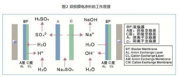 硫酸鈉進入鹽室時,在直流電場作用下,硫酸根離子通過陰膜遷移至酸室,遇到雙極膜的陽膜面,由于陽膜面帶負電,所以硫酸根離子無法繼續遷移,留在酸室,跟雙極膜陽膜面分解出的氫離子結合生成硫酸。雙極膜的陰膜面在直流電場的作用下,不斷分解出氫氧根離子,在堿室跟鈉離子結合,生成氫氧化鈉。最終硫酸鈉通過雙極膜電滲析實現了鹽轉化為硫酸和氫氧化鈉。